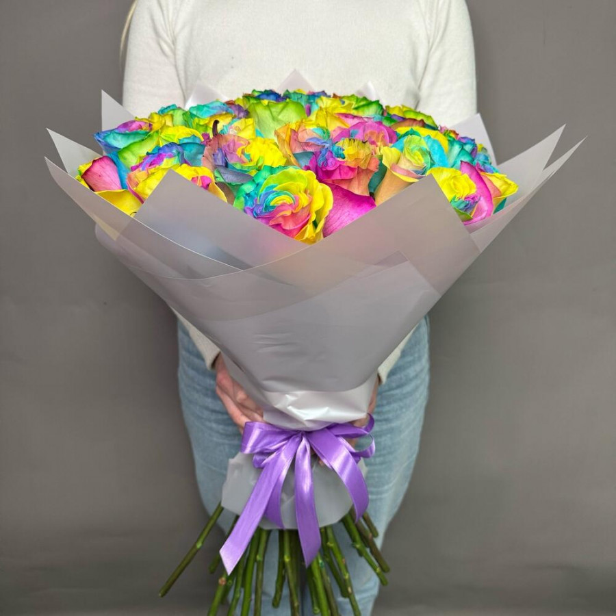 Радужная роза - 35 шт. Дизайнерская упаковка - 1 шт. бант атласный - 1 шт.