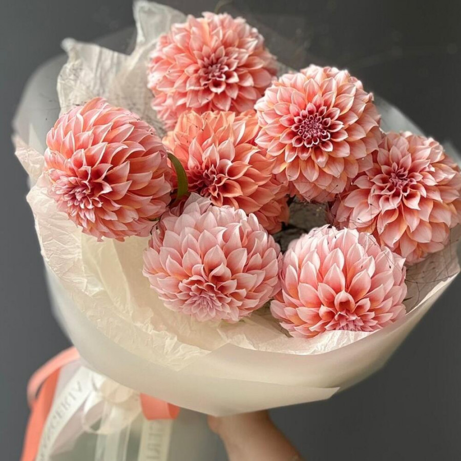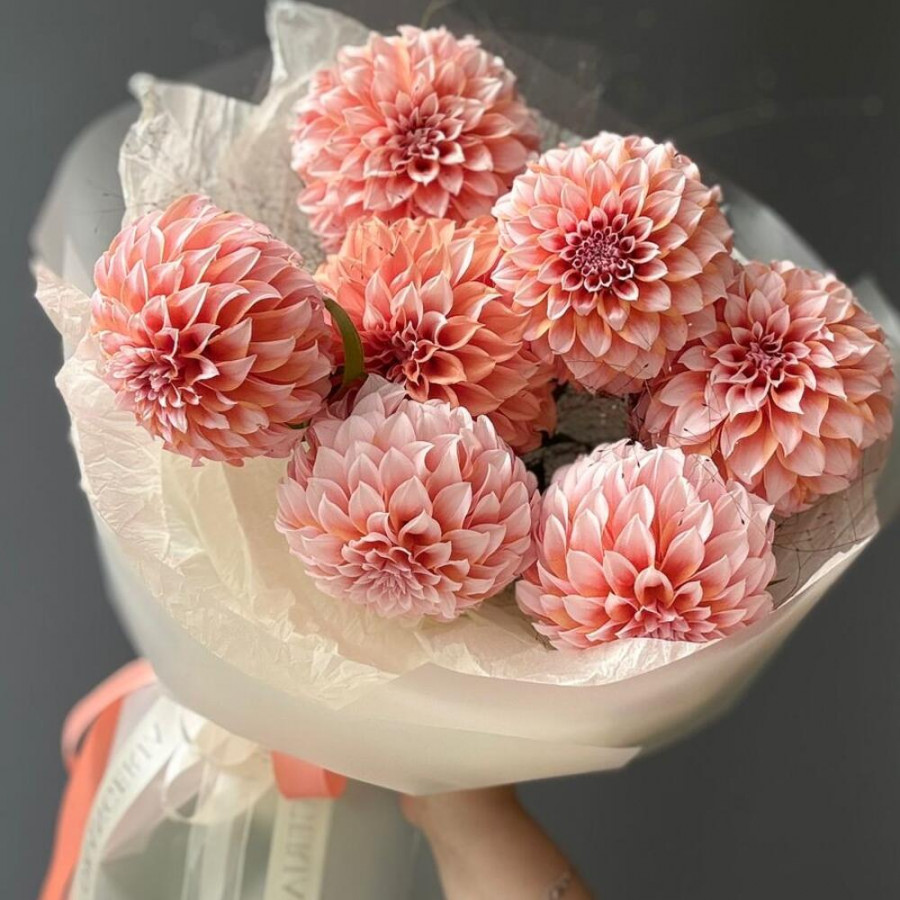 На фото букет из 7 персиковых георгин. В составе: георгина 7 шт, зелень 3 шт, дизайнерская упаковка 1 шт, атласная лента 1 шт, . Все цветы свежие и ароматные, букет красиво оформлен и отлично подходит для подарка. Доступна доставка цветов или самовывоз.
