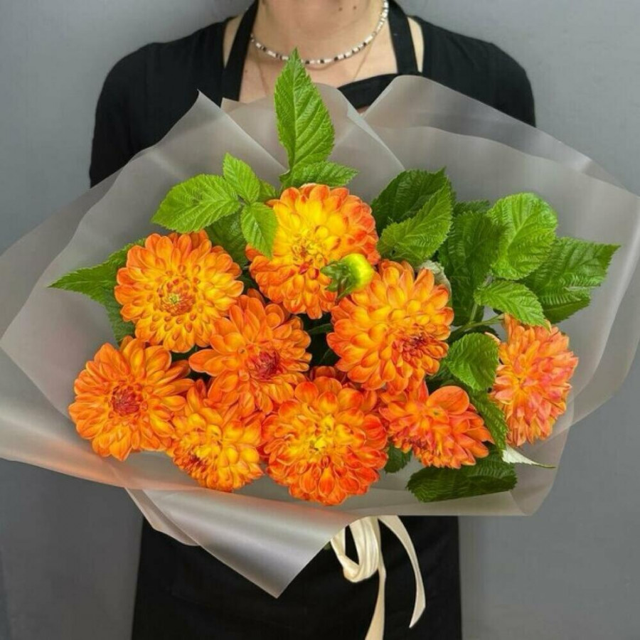 На фото букет из 9 оранжевых георгин. В составе: георгина 9 шт, зелень 3 шт, дизайнерская упаковка 1 шт, атласная лента 1 шт, . Все цветы свежие и ароматные, букет красиво оформлен и отлично подходит для подарка. Доступна доставка цветов или самовывоз.